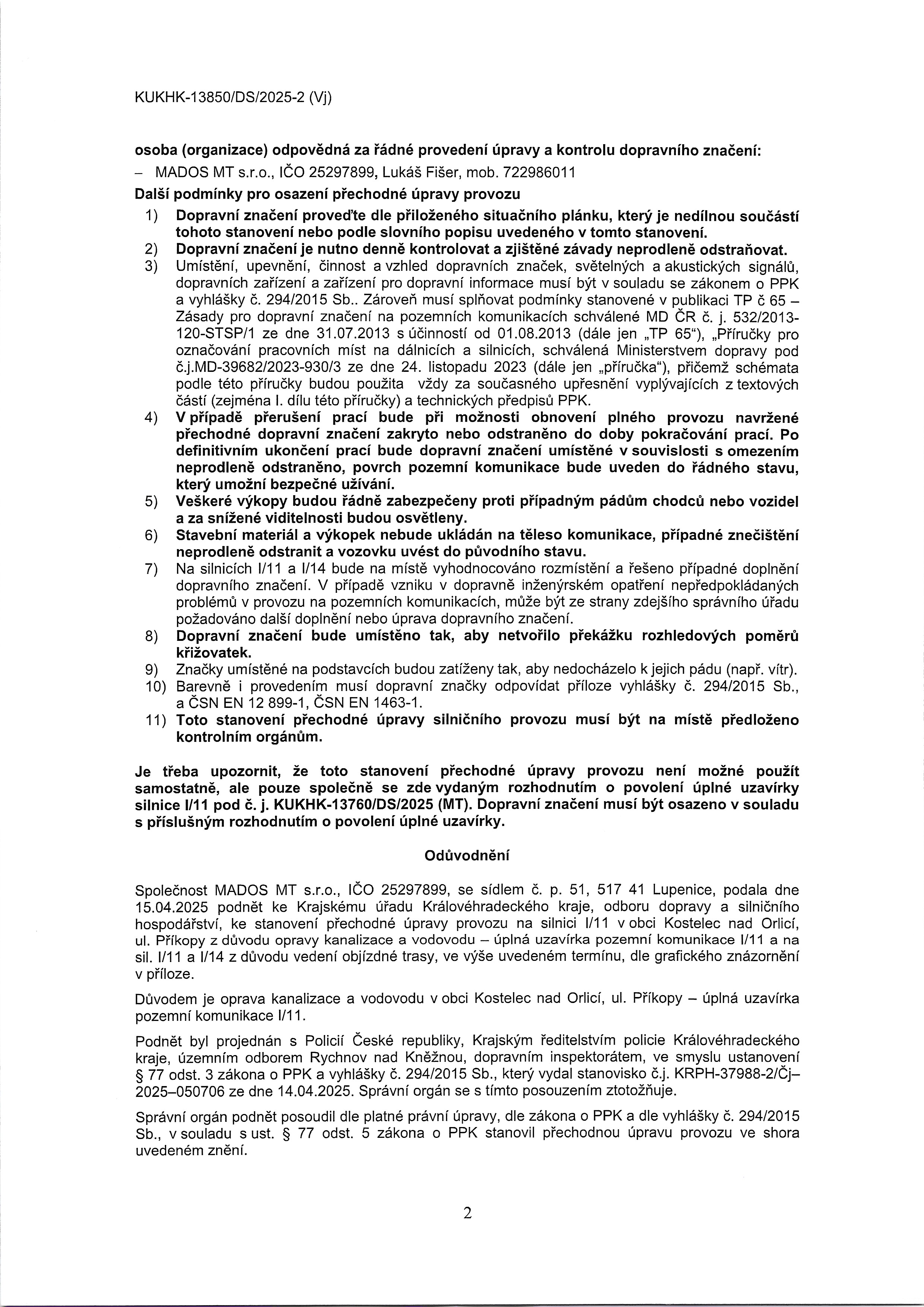 stanovení PÚP-OOP - I/11, I/14 Kostelec nad Orlicí, ul. Příkopy - oprava vodovodu a kanalizace - úplná uzavírka PK